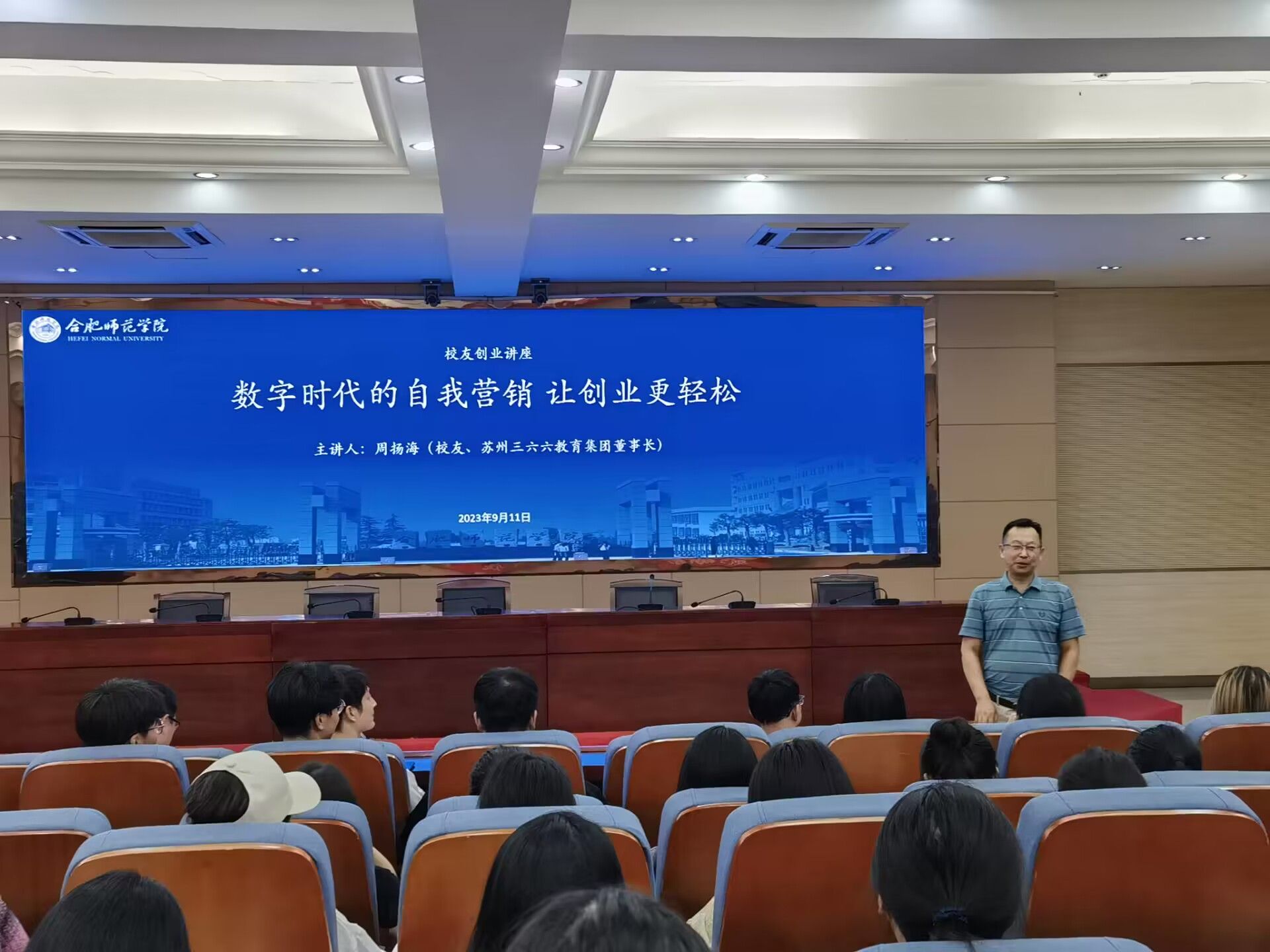 讲座中,周扬海以《数字时代的自我营销让创业更轻松》为题,围绕“创业的艰辛与快乐”“创业者需要具备的条件”“创业目标的确立”等方面,分享了自己十五年来的创业历程,梳理了数字时代大学生创业的机遇与挑战,分析了当前大学生创业现状和常见问题困难等,传授了如何充分利用新媒体开展商业运营、自我营销以及打造个人IP等经验,希望同学们学会做时间的朋友、找到适合自己的创业领域,在创业实践中要有自己的判断和果敢,并表示将与学院合作,为同学们创业提供资金与技术支持,真诚地欢迎大家毕业后到三六六教育集团就职。