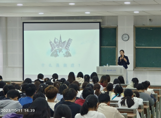 在本次宣传周中,学院首次开展“心理医生进校园”主题活动,邀请安徽精神卫生中心精神科主治医师郑明明和安徽医科大学附属巢湖医院精神科副主任医师宋苏琪来院开展精神卫生主题讲座。郑明明以“消除病耻感,关注精神健康”为主题,从常见的精神卫生现象引入,向同学们讲解了精神卫生的相关概念、心理疾病的成因以及心理疾病的症状表现,并通过丰富的临床案例科普了心理疾病治疗的必要性以及可治愈性,最后就睡眠障碍、抑郁症等常见精神心理问题的识别和应对方式进行了科普宣教。宋苏琪以“与焦虑和解”为题,向同学们讲诉了焦虑情绪的生理和心理表现、焦虑与焦虑症的区别与联系以及缓解焦虑情绪“加减法”技术,最后运用正念技术带领同学们体会缓解焦虑情绪的方法。本次“心理医生进校园”活动,全校400余名学生参加,现场氛围热烈,同学们认真听讲,反馈良好,并期待学院开展更多类似的讲座活动。