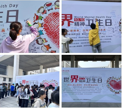 学生工作处心理健康教育中心分别在锦绣校区生活广场与滨湖校区博学楼前放置大型展板,开展关注精神健康签名活动,并赠送象征中国精神卫生标志的绿丝带。随后将已签满姓名的展板进行为其3天的宣传,吸引全校学生关注,营造了关注心理健康的浓郁氛围。