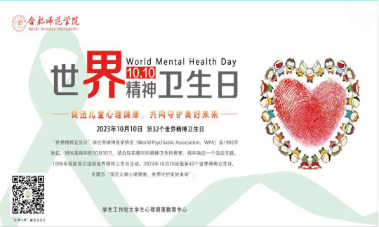 2023年10月10日是第32个“世界精神卫生日”,主题为“促进儿童心理健康,共同守护美好未来”。为增强我院学生心理健康意识,提升学生精神卫生水平,营造良好心理健康氛围,学院于10月9日至13日在全院范围内开展了世界精神卫生日宣传活动。