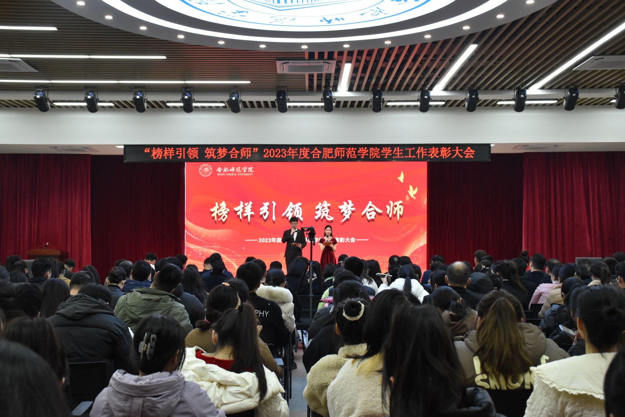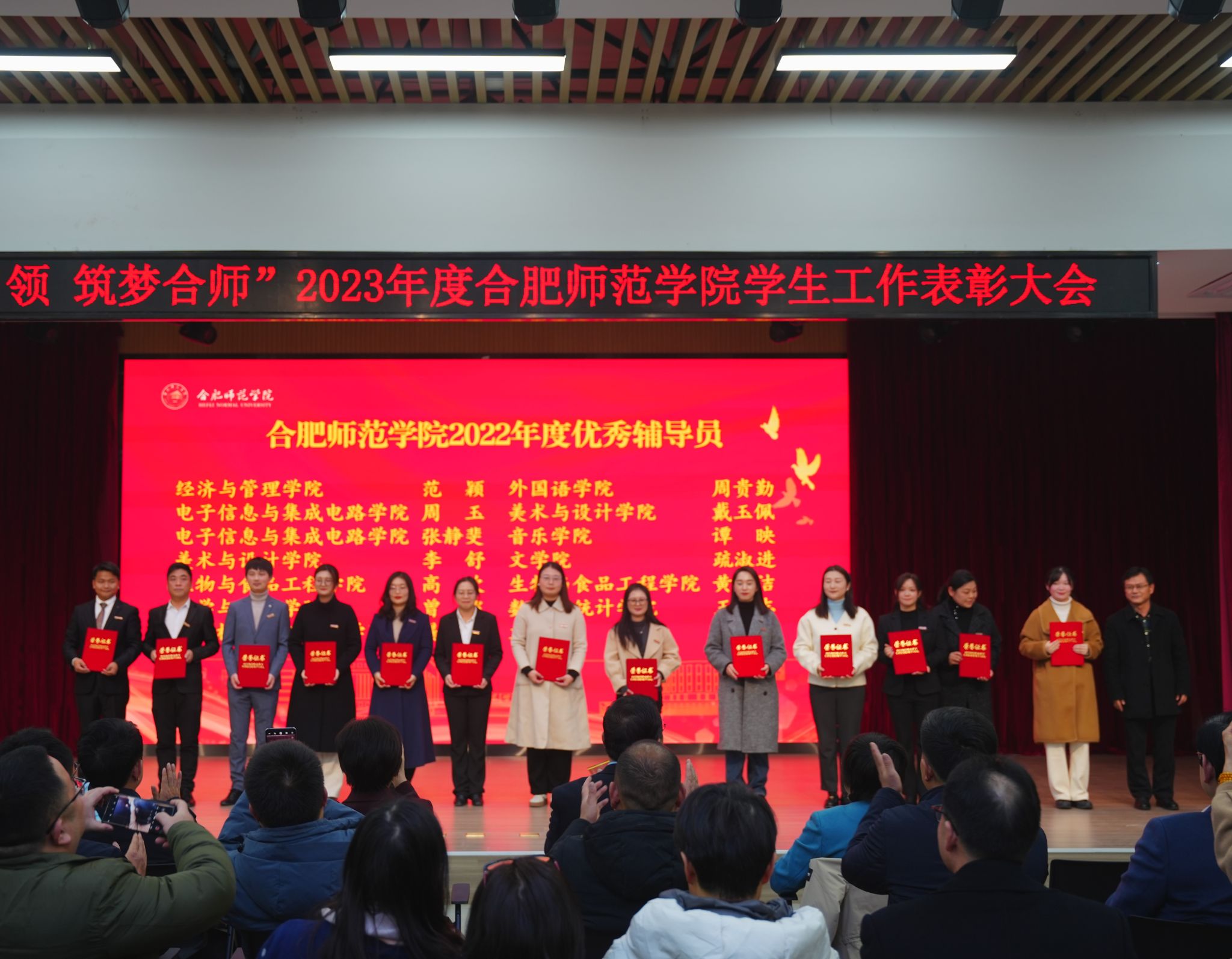 12月28日下午,学院在锦绣校区大学生活动中心举行“榜样引领 筑梦合师”2023年度学生工作表彰大会。院党委书记徐成钢,院党委副书记、院长方东玲,院党委副书记梁立昌,院纪委书记、监察专员徐文林,院党委委员、组织部部长赵帮恚,院党委委员、宣传部、统战部部长常树宝出席大会,有关部门负责人,各二级学院党委书记、副书记,全体辅导员,学生代表参加大会。