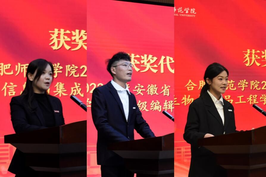 2023年度安徽省大学生年度人物、文学院2021级编辑与出版专业杜程,学院2022年度优秀辅导员、电子信息与集成电路学院辅导员周玉,学院2023年度十佳优良学风班级、生物与食品工程学院2021级生物制药专业陈晴,作为获奖集体和个人代表发言,表示将珍惜荣誉、接续奋斗,为学院全面建成特色鲜明的地方应用型高水平大学而不懈奋斗。