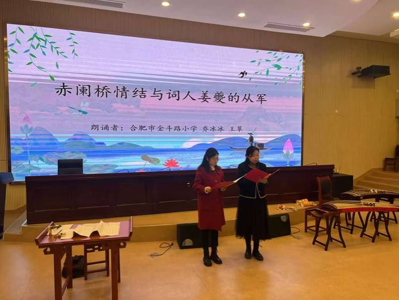 首先向大家呈现的是合肥本土故事《赤阑桥》,音乐学院江楠团队表演了《赤阑桥畔》,青轻读书会成员、来自包河区金斗路小学乔冰冰和王翠老师带来了散文朗诵《赤阑桥情结与词人姜夔的从军》。我校钱立青教授根据庐州民间传说创作了同名剧本《赤阑桥》。作品以南宋著名词人姜夔与赤阑桥畔琵琶女的知音情缘为线索,演绎出了人民大众奋起抗争外族入侵、誓死保卫家园的一段凄美的故事。《赤阑桥》已经成为合肥城市的一个文化标识。我院师生非常重视传统文化的传承与创新,组建了诸多团队开展研究与创作,编排并上演了话剧版《赤阑桥》,创作了动漫版《赤阑桥》,作品荣获了全省第七届大学生艺术展演的戏剧二等奖和设计二等奖。同时,学生以“合肥往事《赤阑桥》的原创绘本设计”入选2023全省大学生创新创业训练计划。通过《赤阑桥》,现场不少同学表示对“大湖名城”的合肥有了新认识,充分体现了挖掘区域文化资源的价值与意义。