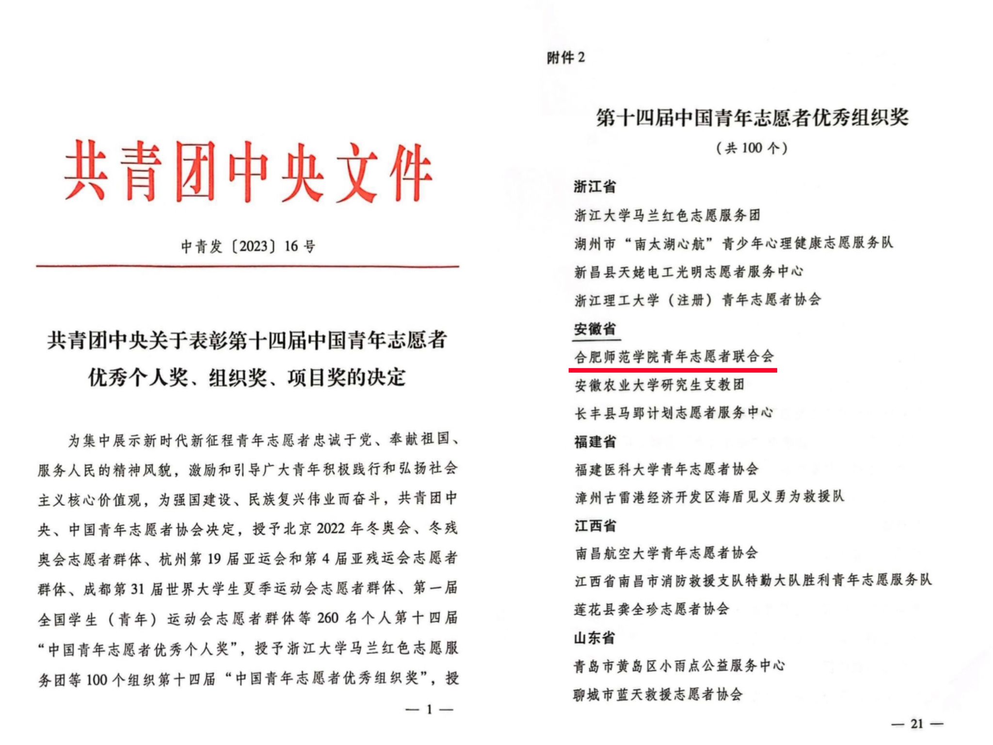 近日,共青团中央印发《关于表彰第十四届中国青年志愿者优秀个人奖、组织奖、项目奖的决定》,我院青年志愿者联合会荣获第十四届中国青年志愿者优秀组织奖。该奖项是我国青年志愿服务领域的最高荣誉,本次全国共有100个组织获奖,安徽省仅3个。