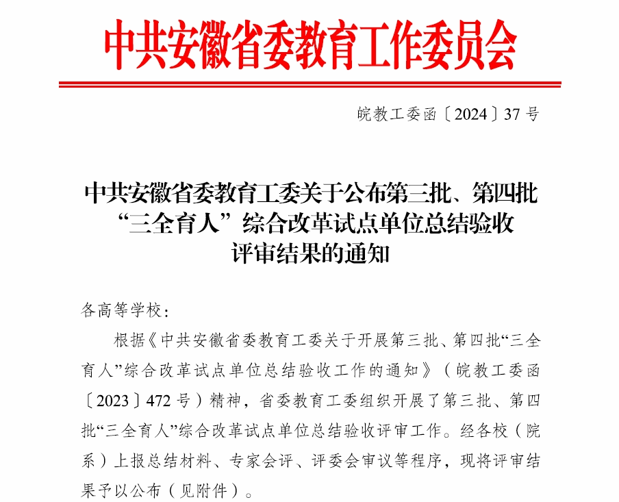 近日,省委教育工委发布《中共安徽省委教育工委关于公布第三批、第四批“三全育人”综合改革试点单位总结验收评审结果的通知》(皖教工委函〔2024〕37号),我校作为安徽省第三批“三全育人”综合改革试点高校,数学与统计学院、生物与食品工程学院作为第三批试点院系,均顺利通过总结验收。