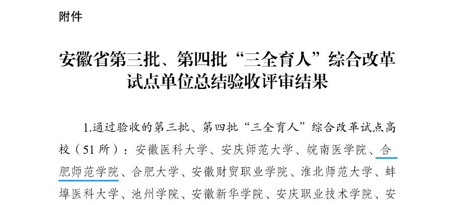 自获批“三全育人”综合改革试点高校以来,学校党委高度重视,成立由学校党政主要负责人为双组长的“三全育人”综合改革试点工作领导小组,对标建设标准,制定工作方案和相关配套实施细则,全面统筹办学治校各领域育人资源和力量,形成了党委统一领导、部门分工负责、院系组织落实、全员协同参与的责任体系。课程育人全面推进。完成“三个一百”课程思政专项建设计划,学校获批安徽省课程思政先行高校、省级教学团队和教学名师各2人,不断深化思政课改革创新,成立全省首个“合肥地区大中小学思政课一体化建设备课联盟”。科研育人着力加强。依托省、校平台,搭建“电子信息系统仿真设计省重点实验室”“青少年心理健康与危机智能干预省社科重点实验室”等省级科研平台14个。实践育人成果丰硕。建设省级创新创业学院,学院连续四年荣获全省职业规划大赛一等奖。开办特色实践活动“行知学堂”,服务留守儿童,获评中国青年志愿服务项目大赛金奖等国家级荣誉。文化育人特色鲜明。连续举办28届大学生科技文化艺术节,连续举办16届“感动合师”十大青年学生评选活动,在时间积淀中不断擦亮校园文化品牌。网络育人亮点纷呈。升级校园网主页,策划《三全育人进行时:师者说•同学谈》《致敬吾师》等专栏,加强全媒体中心建设,培育网络名师,精心搭建网络育人平台。心理育人大力促进。建立四级心理危机干预体系,开展“一院一品”等心理健康品牌项目创建,《心理学》课程入选国家级一流课程,23年5月省心理健康平台正式运行。管理育人扎实推动。强化顶层设计、运行机制和队伍建设,在领导带头中大力倡导育人之风,在规章制度中精准体现育人优先,在管理服务中积极落实育人使命。服务育人不断深化。“一分钱早餐”活动被国家级媒体多次报道,“一站式”学生社区打通育人“最后一公里”,“智慧校园”综合系统持续完善,信息化服务师生效能显著提升。资助育人精准推进。创新资助育人形式,开通“绿色通道”,开展诚信感恩主题教育、“出彩合师”等励志典型宣传,落细落实工作体系。组织育人不断优化。学校获批全国高校样板党支部,首批全省高校“双带头人”教师党支部书记工作室。