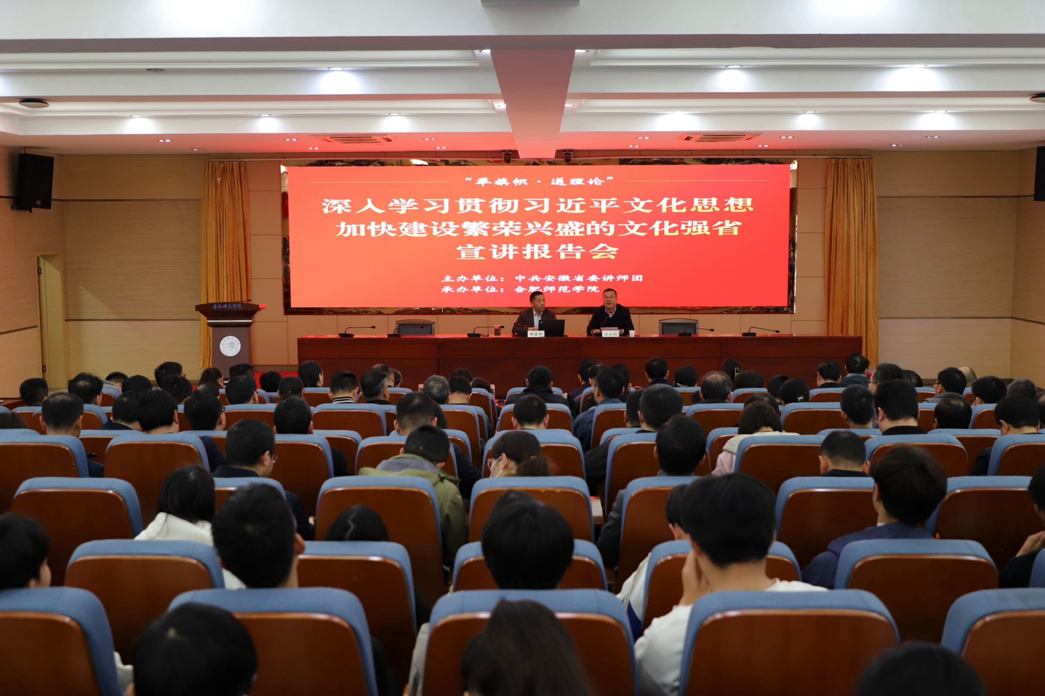 安徽艺术学院原党委副书记、院长樊嘉禄作《深入学习贯彻习近平文化思想 加快建设繁荣兴盛的文化强省》专题宣讲报告,党委书记徐成钢主持报告会。学院党政领导班子成员、全体处级干部,大学生宣讲团成员、教师、辅导员以及学生代表等近300人听取报告。
