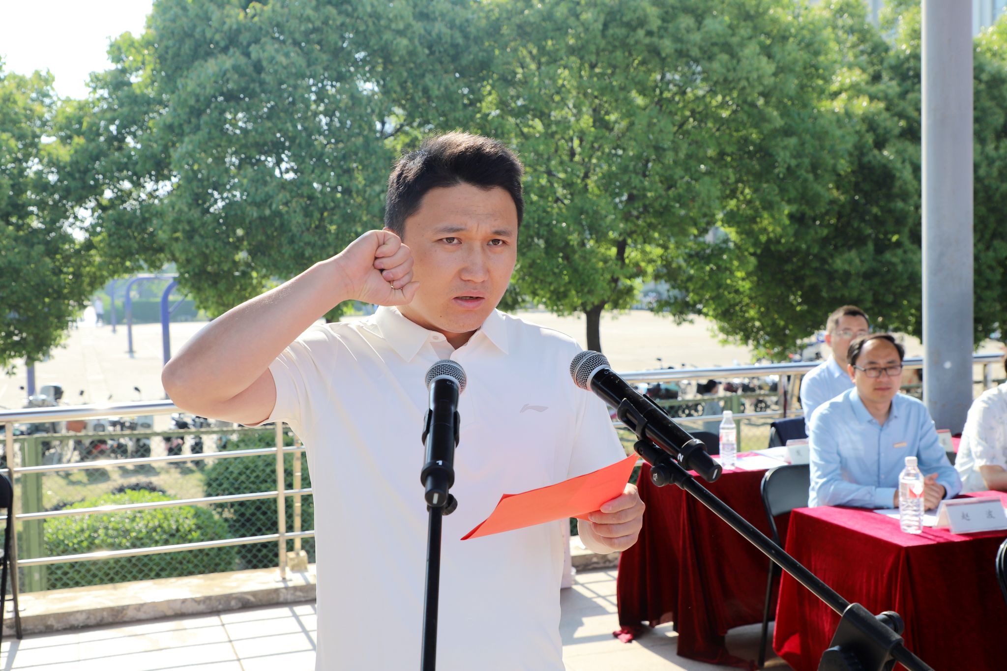 开幕式上,文学院学生施沐苒代表全体运动员宣誓;体育科学学院教师吴友良代表全体裁判员宣誓。