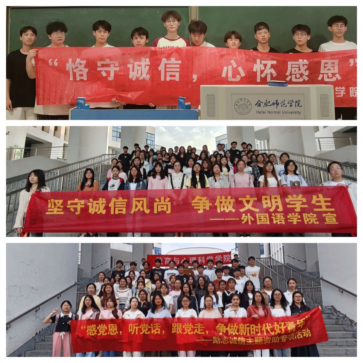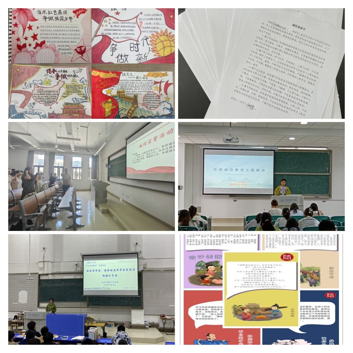 教育与心理科学学院围绕诚信感恩教育,开展了志愿服务、书法展、手抄报等系列活动,做到受资助学生全员覆盖、全员参与,进一步引导广大学生深入了解国家资助政策和学院工作举措,在系列活动中进一步强化感恩意识和诚信意识。化学与制药工程学院开展以涵盖历史诚信故事、当代诚信事迹、诚信漫画图片、诚信书法作品等内容的诚信图片展,线上浏览量达1000多人次。外国语学院通过“外院新青年”网络平台宣传优秀学生代表事迹,鼓励广大学生自觉成为诚实守信、自强不息的文明学生。美术与设计学院结合学科专业特色,举办资助诚信绘画比赛,把资助教育与感恩教育、反诈骗教育等融入学生日常教育中。音乐学院开展诚信感恩征文比赛,鼓励同学用文字讲述自己或者身边人诚信感恩、自立自强的故事。体育科学学院开展受助学生主题座谈会,使学生对国家、学校资助政策有了更为全面的了解,帮助受助学生树立正确的消费观、价值观。经济与管理学院、物理与材料工程学院举办资助诚信教育主题演讲比赛,选手围绕“励志、奋斗、诚信、感恩”四大主题分享成长经历和奋斗故事。数学与统计学院、物理与材料工程学院组织各班级举办诚信励志宣誓活动,全体同学在辅导员或班长的带领下齐声宣读诚信誓词,表达培养诚信品质的决心。外国语学院、音乐学院、马克思主义学院、生物与食品工程学院、音乐学院开展诚信签名活动,在广大同学中间营造出“人人知诚信,人人讲诚信”的良好氛围。电子信息与集成电路学院、化学与制药工程学院、文学院开展签订诚信承诺书活动,倡导学生自觉做到诚实守信,使同学们明确“人无信则不立”的道理。
