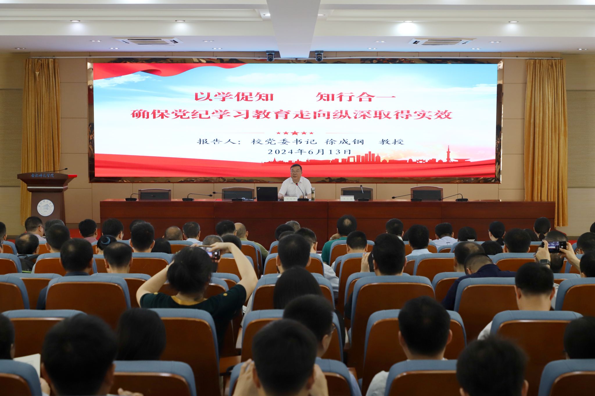 根据党纪学习教育安排,6月13日上午,学院举行党纪学习教育专题党课报告会,院党委书记徐成钢教授作题为《以学促知 知行合一,确保党纪学习教育走向纵深取得实效》专题党课。校党委班子成员、全体处科级干部、党支部书记参加党课学习,院党委副书记梁立昌主持报告会。