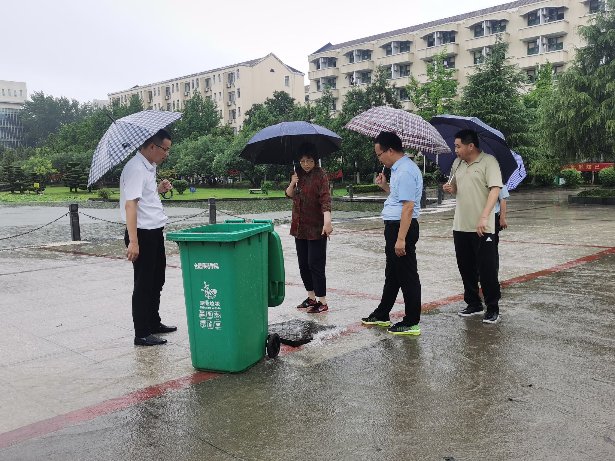 为确保学院有效应对暴雨天气、安全度汛,6月28日下午五点,党委副书记、院长方东玲,党委委员、副院长华银峰带领后勤处(基建办)、保卫处(部)、资产管理处(招标办)等相关部门负责人冒雨对校内重点区域开展防汛安全检查,排查隐患,确保校园平安。