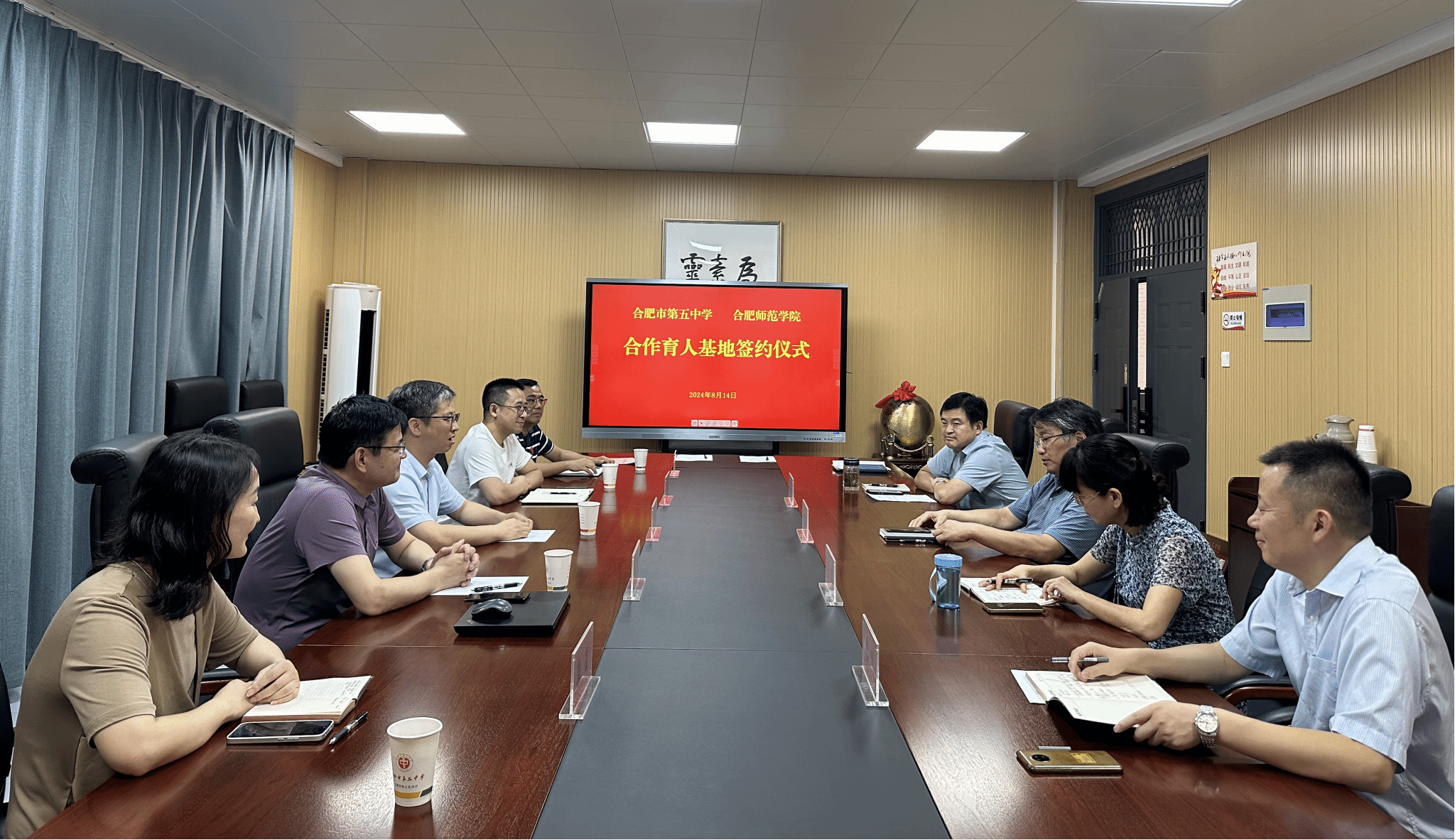 为进一步加强与基础教育交流合作,提升人才培养质量和服务社会能力,8月14日下午,beat365唯一官方网站和合肥市第五中学合作交流活动在合肥五中和平校区举行。合肥五中党委书记熊荣领,党委副书记、校长王岚,党委委员、副校长何劲松、葛暄和我院党委委员、副院长华银峰,教务处处长钱立青、美术与设计学院副院长李辉周等一行5人参加了本次活动。