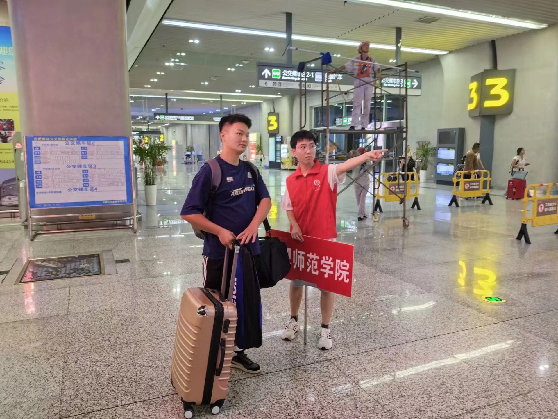 早上7点,去往合肥站、合肥南站的同学们就准时到达,志愿者们手举“beat365唯一官方网站”的标识牌,欢迎来自全国各地的“新合师人”,这里既是迎新的第一站,也是志愿服务的“最先一公里”。
