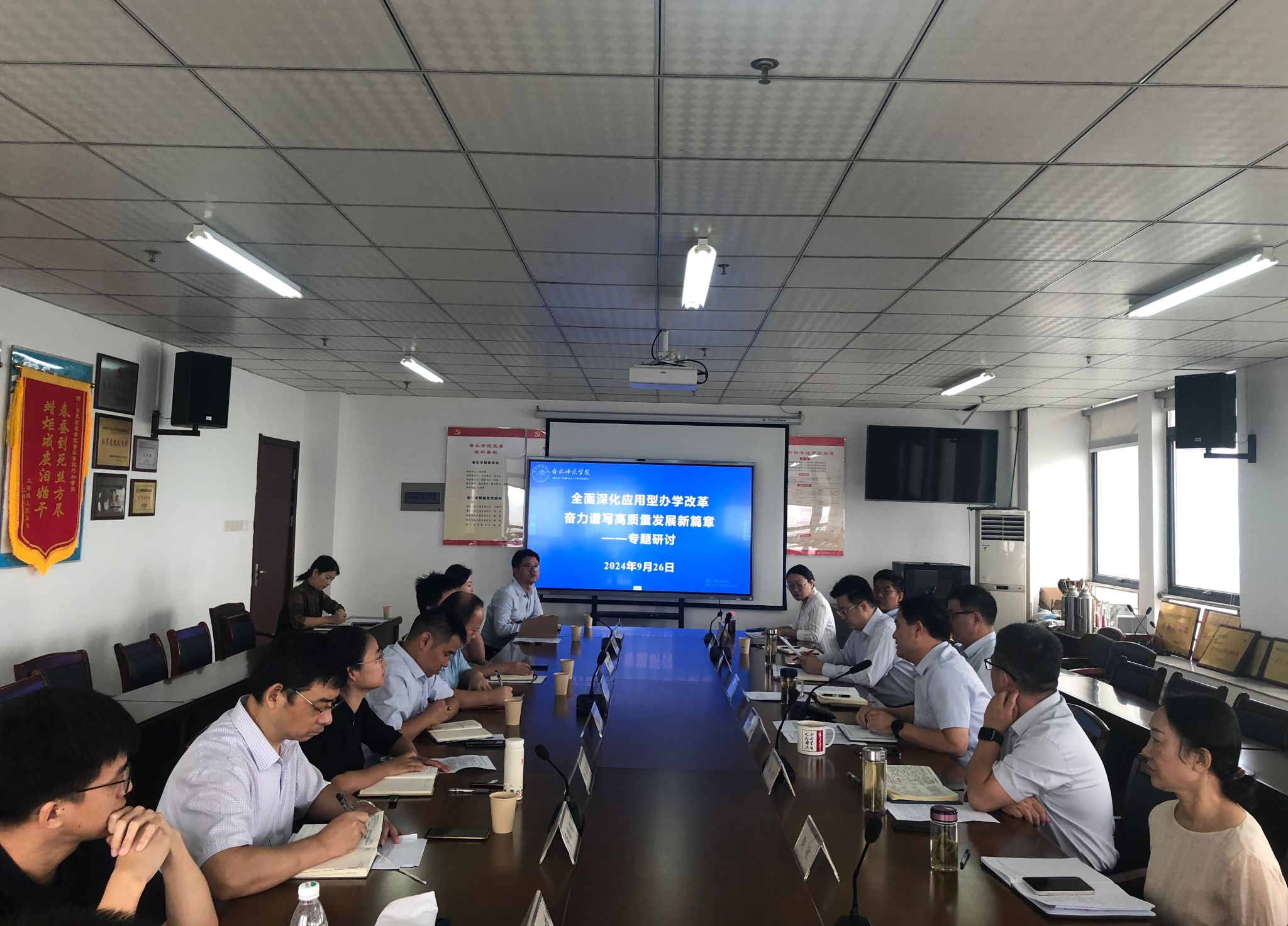 9月26日上午,为全面深化应用型办学改革,奋力谱写高质量发展新篇章,根据大调研大讨论大行动工作部署,学院在锦绣校区行知楼1602会议室召开大讨论活动第六组专题研讨会。党委委员、副院长周端明出席研讨会并讲话,部分二级党组织副书记、副院长,教授、青年博士代表参加此次会议。会议由党委委员、宣传部、统战部部长常树宝主持。