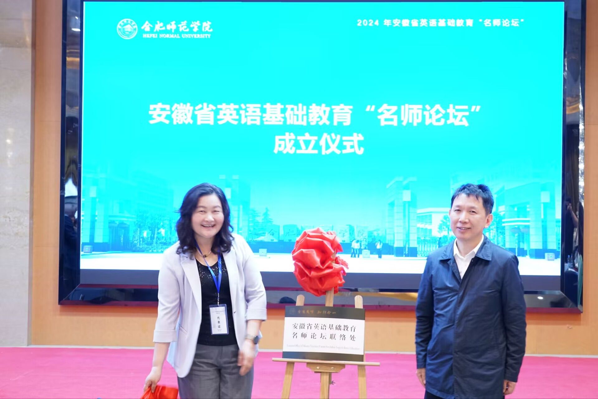 外国语学院院长李可胜介绍了“名师论坛”的成立目标和运作机制,副院长吴礼敬介绍了“基础教育外语教材文献资料库”的建设规划及其预期影响。徐文林和赵杰共同为“名师论坛”联络处揭牌,外国语学院党委书记马四民与上海外语教育出版社安徽区域总经理徐杭共同为“基础外语教材文献资料库”揭牌。