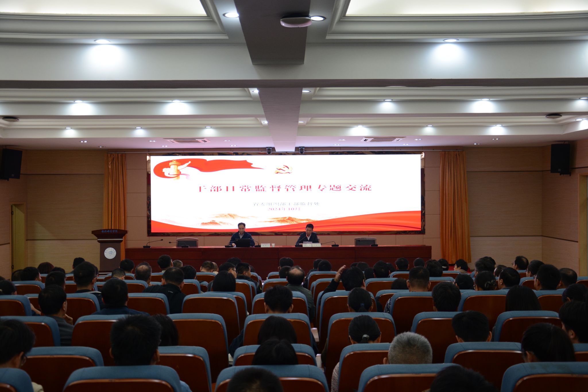 为落实巡视整改工作要求,从严从实加强干部管理监督,着力建设高素质干部队伍,10月22日晚,学院在锦绣校区学术报告厅举办第四期“干部行知夜校”,省委组织部干部监督处副处长梁曌飞应邀围绕干部日常监督管理作专题辅导报告。院领导班子成员、全体处科级干部、党支部书记、党务秘书近300人参加,院党委委员、纪委书记、监察专员徐文林主持会议。