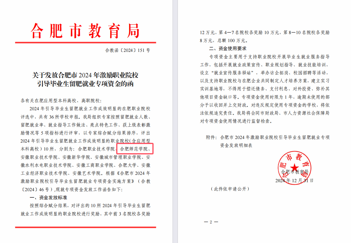 近日,学院在合肥市2024年引导毕业生留肥就业工作成效明显单位评选中获得排名第二的好成绩,并获得专项资金激励。