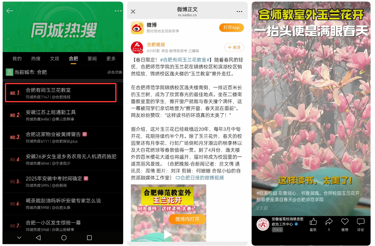 这些作品一经发布,便得到安徽省教育厅官微、安徽省思想政治教育中心视频号合肥日报等媒体平台的转发报道,广大网友也纷纷点赞转发,合师锦绣校区逸夫楼的 “玉兰教室” 一度成为网络热议焦点,引发师生在朋友圈广泛转发,吸引了众多学子前来打卡,生动彰显了校园文化的独特魅力。