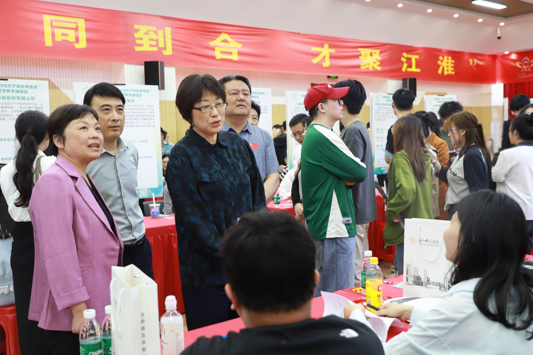 为深入贯彻落实党中央、国务院关于促进高校毕业生就业工作的决策部署,搭建用人单位与毕业生高效对接平台,4月10日,由中共合肥市委、合肥市人民政府主办,中共合肥市委组织部、中共合肥市委人才工作局、合肥市人力资源和社会保障局和我校联合承办的“合肥请您来”专场招聘会在校大学生活动中心成功举办。院党委副书记、院长方东玲,合肥市人力资源和社会保障局副局长刘峰来到现场指导工作。