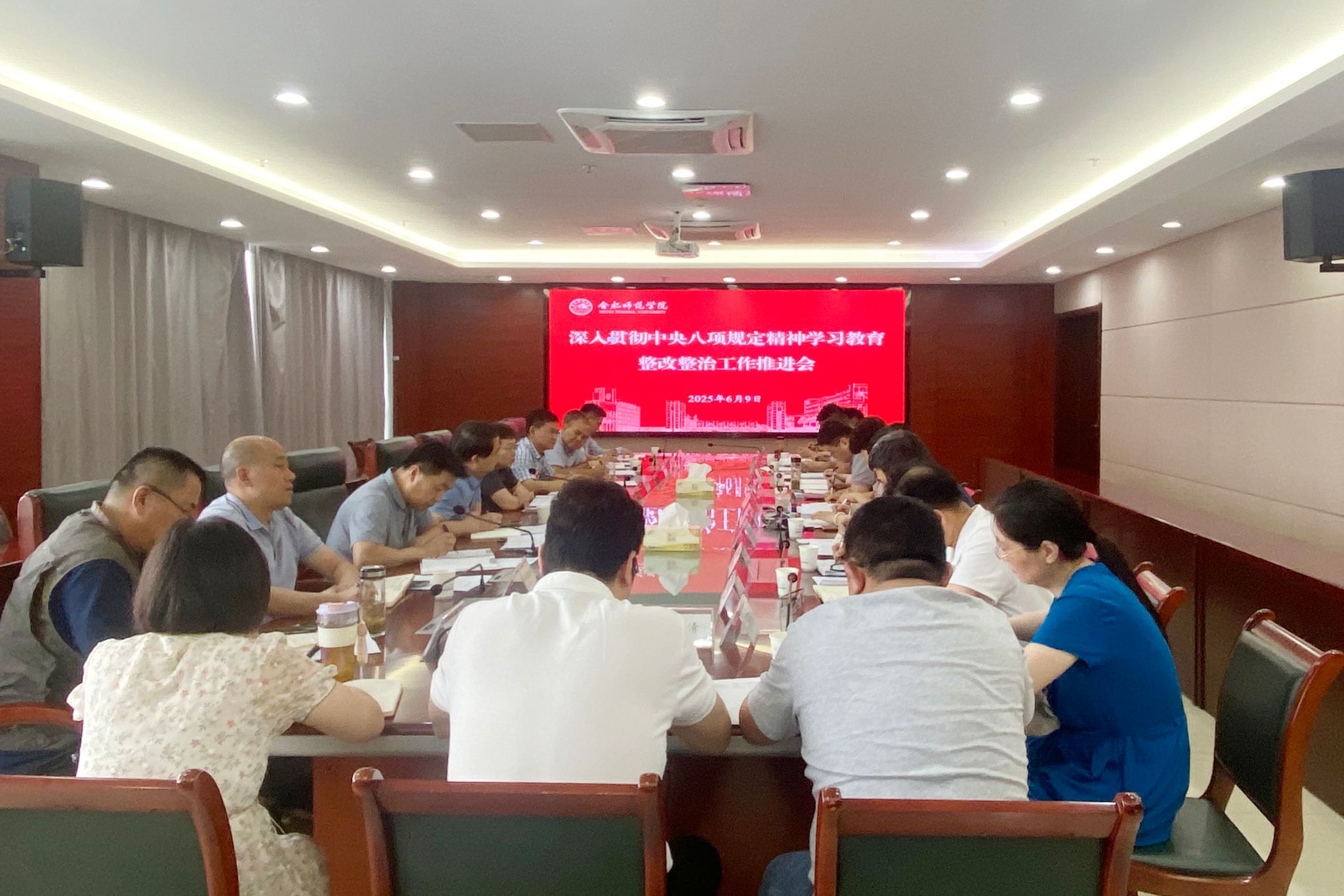 6月9日,学院在行知楼2008会议室召开深入贯彻中央八项规定精神学习教育整改整治推进会,贯彻落实上级关于深入贯彻中央八项规定精神学习教育集中整治的有关要求,对学院学习教育查摆问题及集中整治工作进行再部署再推进。党委副书记梁立昌主持会议并讲话,学习教育工作专班全体成员、各二级党组织书记参加会议。