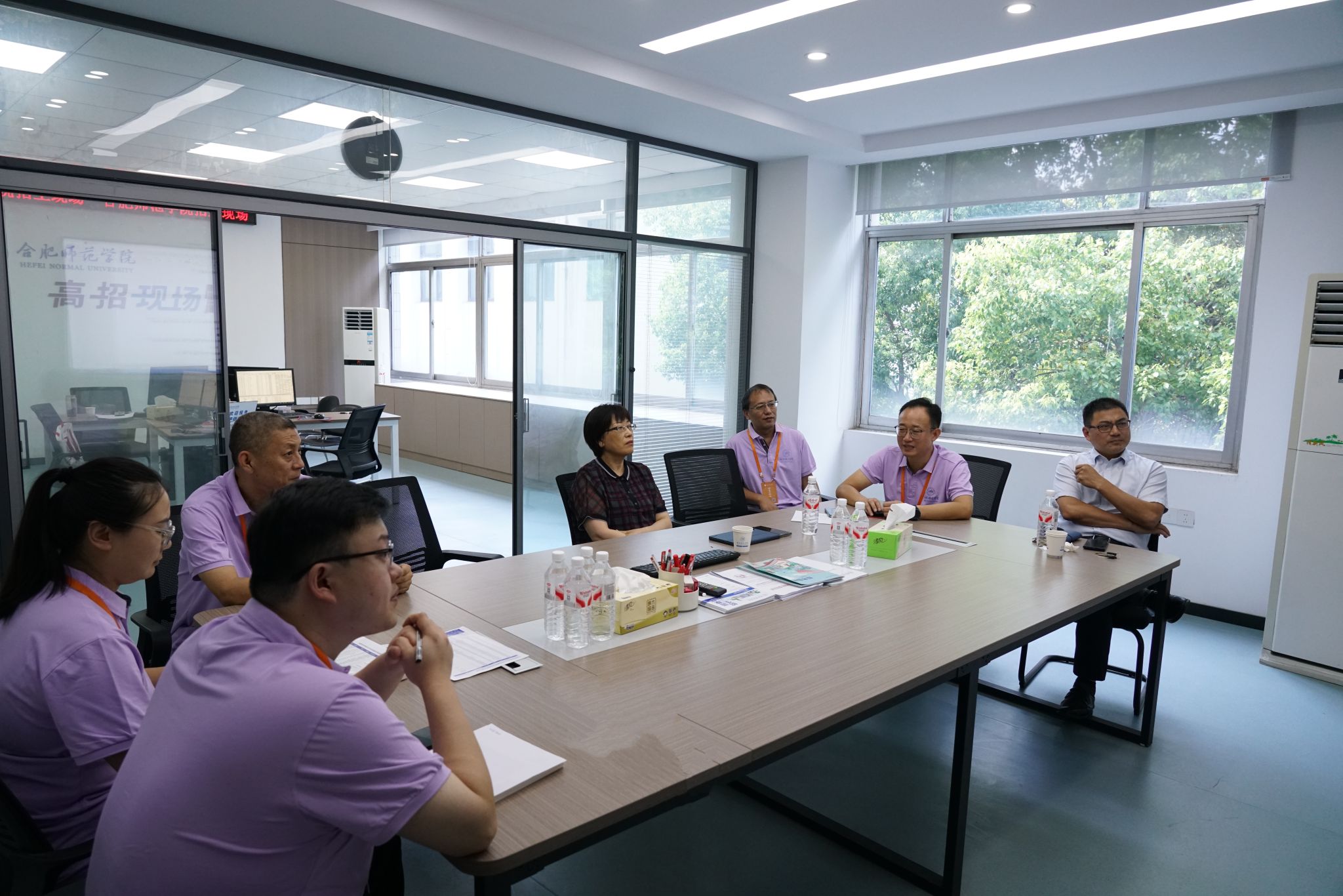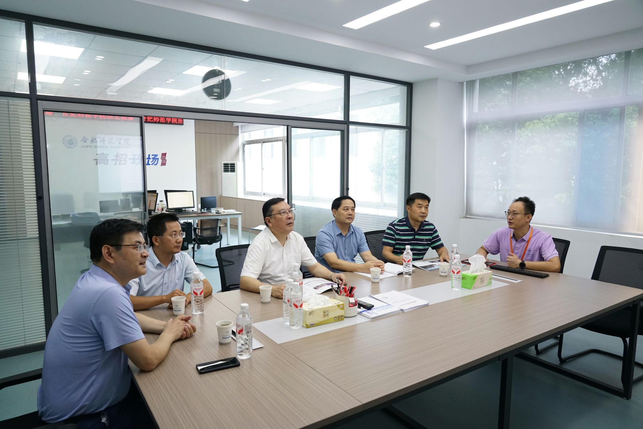 近日,党委书记徐成钢,党委副书记、院长方东玲,党委委员、副院长周端明,在党政办、宣传部、纪委办、教务处、信息化管理处等部门负责同志陪同下,深入三孝口校区招生现场一线,看望慰问奋战在一线的招生工作人员,实地查看招生录取流程、听取工作汇报,指导我院2025年招生录取工作。院领导一行通过实时系统操作演示详细了解各批次、各专业的录取进度、投档比例、分数线及位次、生源质量分布等情况,认真听取了招生办负责人关于学校2025年招生工作整体安排、各省录取进展、招生录取信息公开等情况汇报。院领导对招生工作人员顶烈日、战高温,以饱满热情投入招生工作的奉献精神给予高度肯定。
