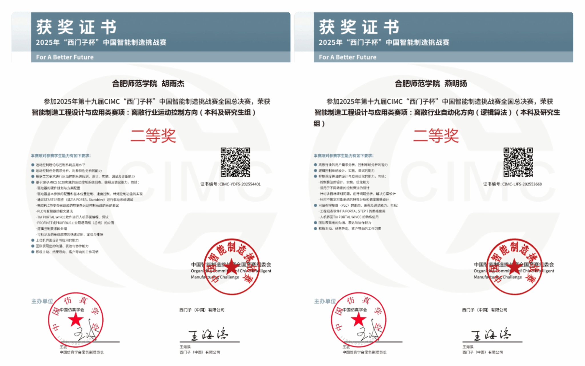 学院高度重视,在领导的关心和老师的悉心指导下,参赛学子刻苦训练、潜心钻研,充分发扬“自强不息、追求卓越”的合师精神,展现了专业素养与青春风采。此次获奖,不仅体现了合师学子在智能制造与自动化领域的创新能力和实践水平,也为学院应用型人才培养成果交上了一份亮丽答卷。未来,学院将继续鼓励学生积极参与高水平赛事,以赛促学、以赛促教,培养更多敢于创新、勇于实践的新时代人才。(电子信息与集成电路学院:李瑞金)