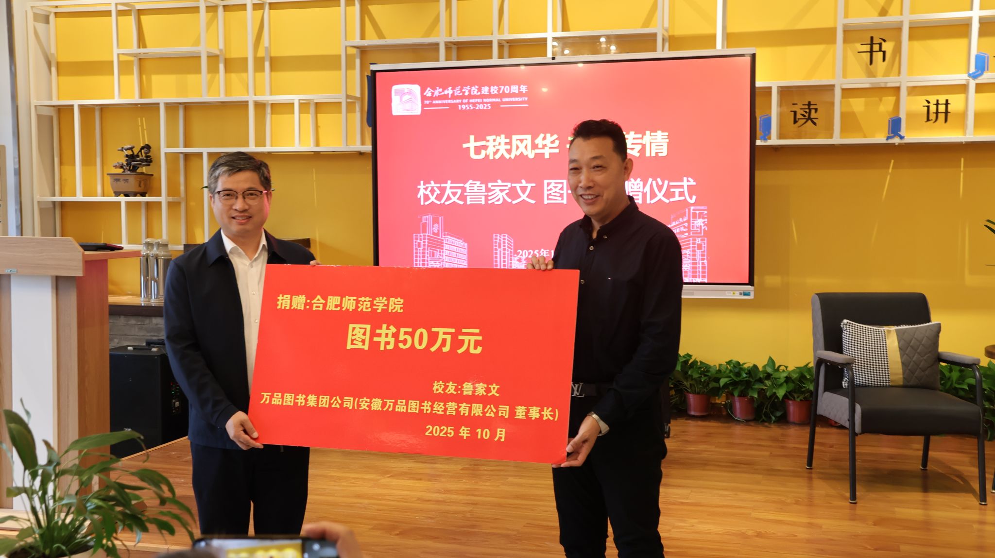鲁家文是我校1996届政教专业校友,毕业后从事出版策划及发行工作,创办了安徽万品图书经营有限公司、北京万品文化传媒有限公司、万品图书(上海)有限公司及线上实体和线下书店。在成功创业的同时,心系母校,个人出资向学校捐赠价值50万元图书支持学校发展。(图书馆、校友办)