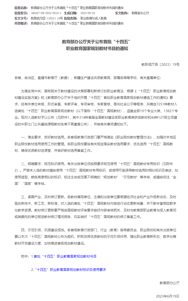 为贯彻落实党中央、国务院关于教材建设的决策部署,教育部组织开展“十四五”职业教育国家规划教材建设工作。“十四五”期间,教育部分批建设1万种左右职业教育国家规划教材,首批遴选7262种。已获“十三五”职业教育国家规划教材和首届全国教材奖优秀教材(职业教育类)将按有关要求复核通过后纳入,新申报教材由教材第一主编所在单位按程序推荐。