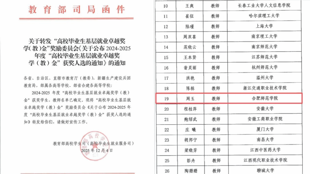 近日,教育部2024—2025年度“高校毕业生基层就业卓越奖学(教)金”评选结果揭晓,我院辅导员周玉光荣上榜。该奖项由教育部高校学生司(高校毕业生就业服务司)、学生服务与素质发展中心共同指导,经严格遴选,本年度全国高校仅58名优秀指导教师获此殊荣。
