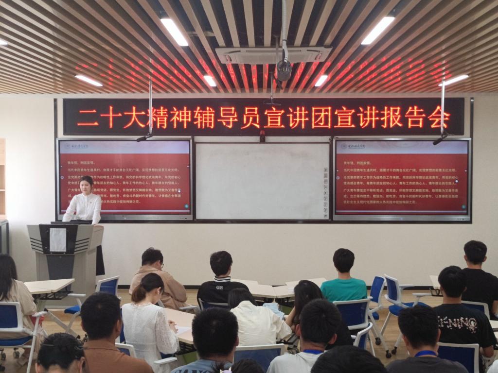 辅导员宣讲团走进学生开展深入学习宣传贯彻党的二十大精神主题宣讲,进一步引领广大青年大学生认真学习贯彻党的二十大精神,怀抱梦想,脚踏实地,砥砺奋进,勇毅前行。(学生工作处;辅导员协会:梁悦)