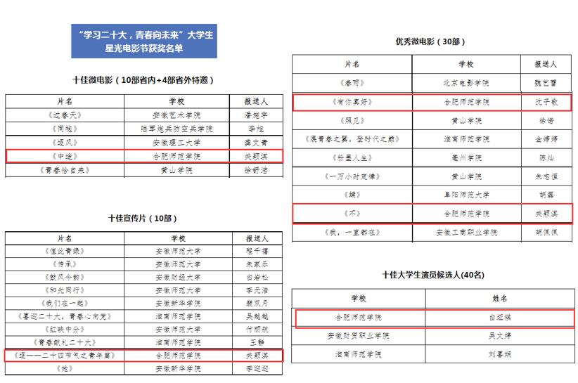 本网讯 近日,“学习二十大、青春向未来”安徽省大学生星光电影节评选活动结果揭晓。我院文学院关颖淇同学摄制作品《中途》获评“十佳微电影”,文学院关颖淇同学摄制作品《逐——二十四节气之青年篇》获评“十佳宣传片”,外国语学院沈子敬同学同学摄制作品《有你真好》、文学院关颖淇同学摄制作品《不》获评“优秀微电影”,外国语学院白垭淇同学入选“十佳大学生演员候选人”。