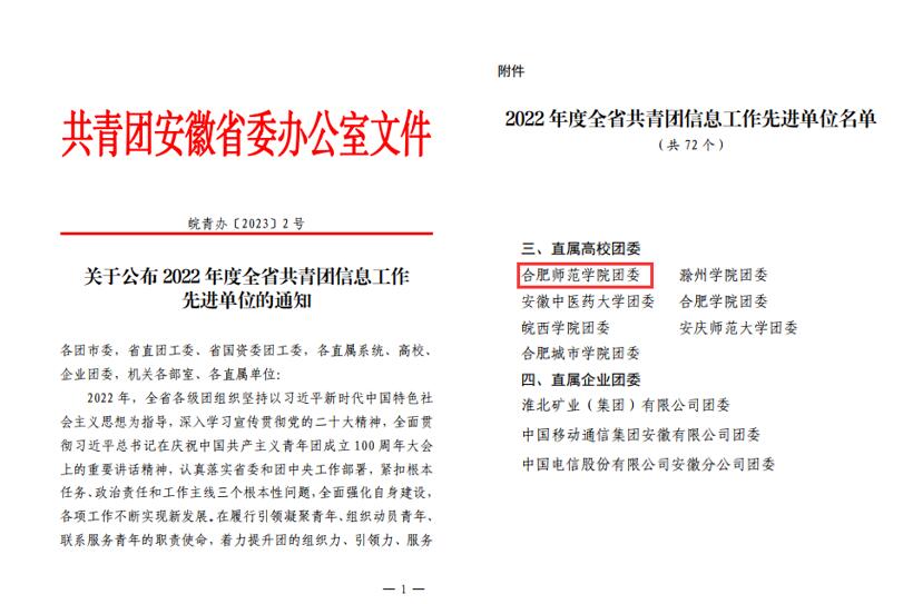 本网讯 近日,共青团安徽省委印发《关于公布2022年度全省共青团信息工作先进单位的通知》,我院榜上有名,全省共72个单位(其中直属高校团委7所)获此荣誉。这是我院继2018年、2020年、2021年以来,第四次获评此荣誉称号。