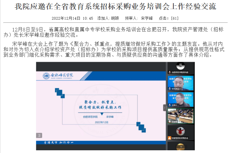 其中,资产管理处(招标办)处长宋学峰作为代表,在安徽省2022年度全省教育系统招标采购业务培训会上做了题为《聚合力、抓重点,提质增效做好采购工作》的主题交流发言;资产管理处(招标办)招标采购科科长吴科能,在2022年度安徽省教育厅主办的安徽省高校采购业务技能大练兵活动中,荣获个人一等奖和安徽省2022年度高校招标采购先进个人的佳绩。