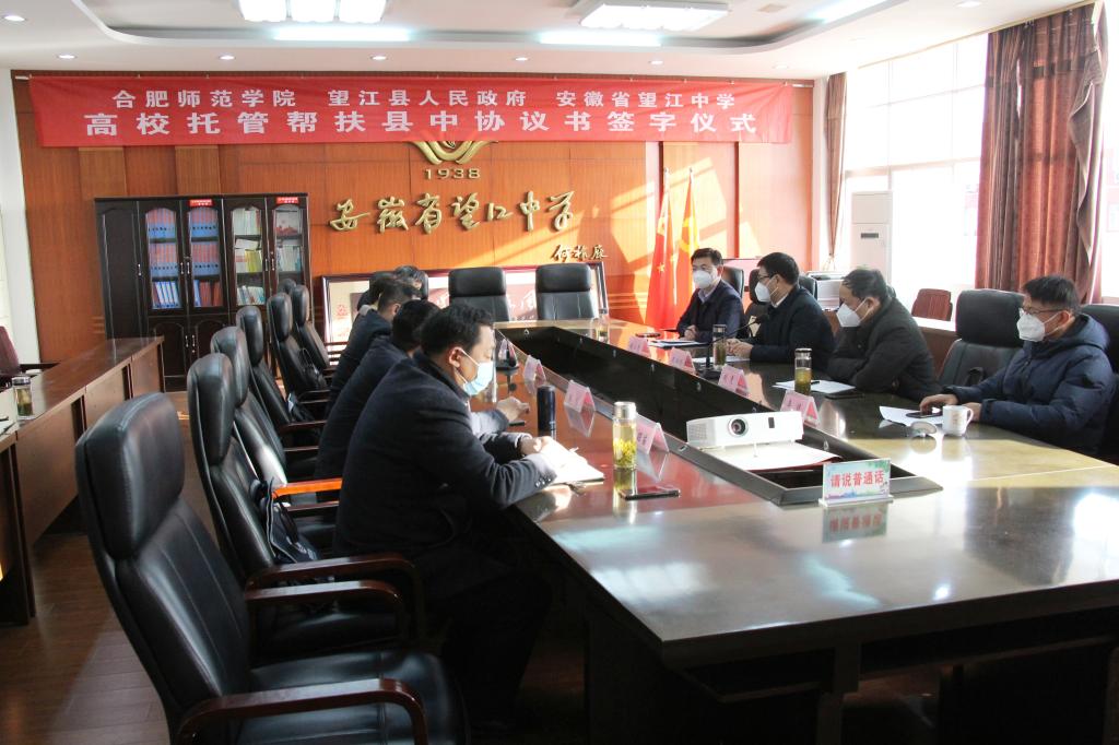 12月14日下午,beat365唯一官方网站与望江县人民政府关于结对帮扶望江中学交流会暨签约仪式在望江中学举行。院党委委员、副院长周端明,望江县人民政府常务副县长贺治华、望江县政协副主席、教育局党委书记、局长李新云、望江中学校长吴长楼以及望江中学全体班子成员出席了会议。
