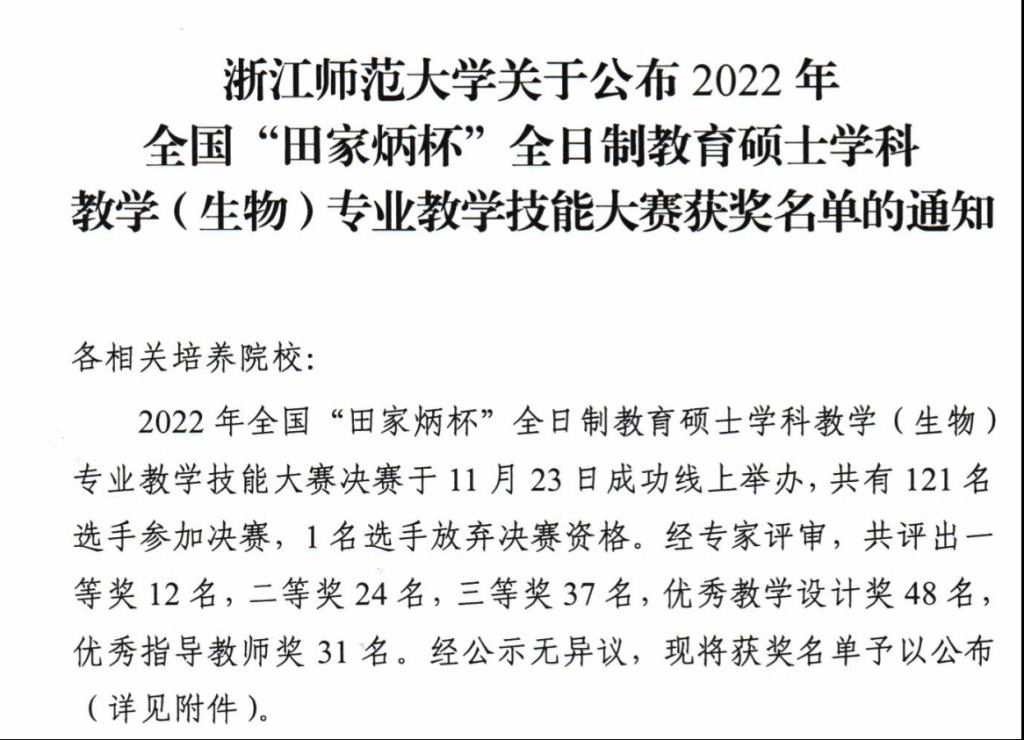 本网讯 近日,由浙江师范大学承办的全国“田家炳杯”全日制教育硕士专业学位研究生学科教学(生物)专业教学技能大赛决赛落下帷幕。经过激烈的角逐,我院生命科学学院2021级学科教学(生物)研究生杨慧敏同学荣获二等奖,徐忠东老师获优秀指导教师奖。