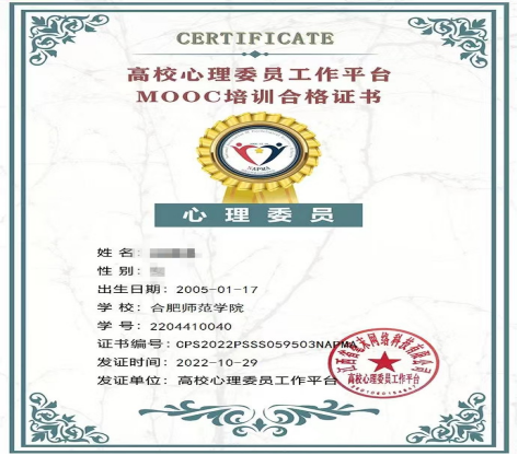 线上MOOC培训依托“全国高校心理委员工作平台”进行,经过14个专题的MOOC培训,心理委员们对心理健康知识与工作职责有了初步的认识,并全部通过测试获得心理委员MOOC培训合格证书。