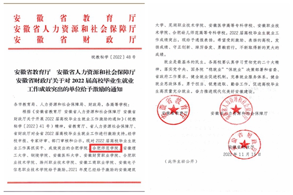 本网讯 日前,安徽省教育厅、安徽省人力资源和社会保障厅、安徽省财政厅联合印发《关于对2022届高校毕业生就业工作成效突出的单位给予激励的通知》,学院被评为2022届高校毕业生就业工作成效突出单位,这也是学院首次获此殊荣。