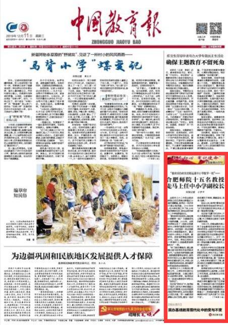 我校教师挂职基础教育工作产生了良好的示范效应和广泛的社会影响,2019年12月11日,《中国教育报》在头版显著位置以《合肥师院十五名教授走马上任中小学副校长》为题进行了专题报道。