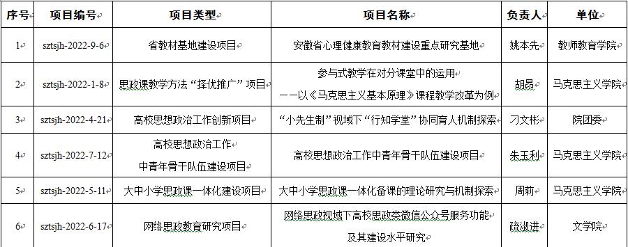 本网讯 近日,中共安徽省委教育工委、省教育厅发布《关于公布2022年安徽省“三全育人”试点省建设暨高校思想政治工作能力提升计划立项结果的通知》(皖教工委函〔2022〕278号)文件,经各高校申报、省委教育工委网络评审、会议评审和公示,我院共有6个项目获得省级立项,在全省同层次高校中位居前列,充分彰显了学院持续构建全员、全程、全方位育人格局和不断完善思想政治工作体制机制的试点成果。