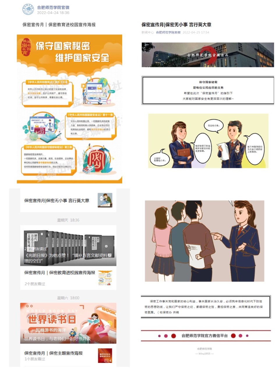 开设一个线上保密专栏。在校园网保密工作专栏开设“宣传教育、保密动态、保密知识”等版块,发布国家安全保密宣传海报、公益片视频、保密漫画、保密知识、警示案例等;并会同宣传部同步在学院官微公众号每日推送转载,截至4月26日点击总量近千人次。