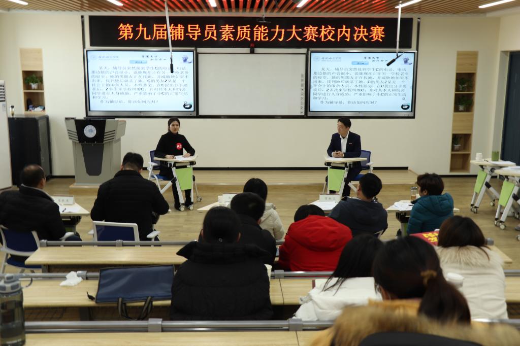 12月30日下午,辅导员素质能力大赛校内决赛在逸夫楼A502教室举办。安徽建筑大学学生工作部副部长汤娜、合肥学院学生工作部副部长许刚、学校财务处处长常树宝、党委教师工作部部长吴长龙以及学生工作部部长陆涛担任评委。