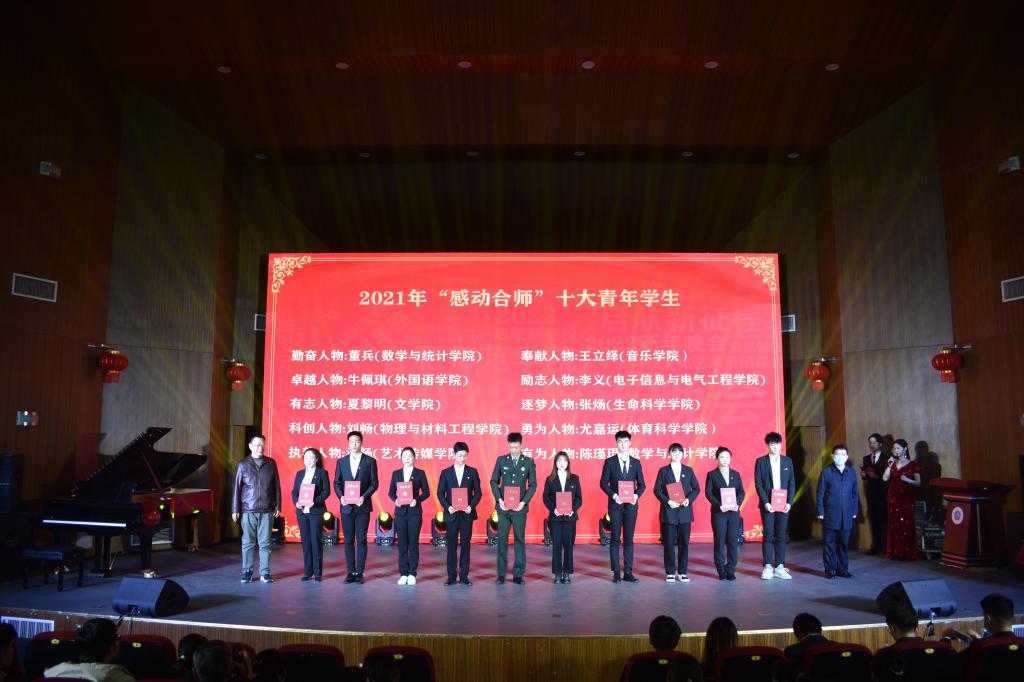 本次评选活动历时近两个月,得到各二级学院党组织的高度重视与大力支持。各二级学院团委、团支部严格按照评选活动的评选标准和程序要求,共推荐产生候选人38名,并根据候选人上报材料撰写了详细的人物事迹介绍。经过主办单位会议评审,最终确定10位同学获得“感动合师”十大青年学生称号,分别是:荣耀加身,数学天骄,关心集体,抗击疫情,用自己的实际行动诠释奋斗的青春无怨无悔的 “勤奋人物”――数学与统计学院董兵同学;严于律己,宽以待人,统筹全局,乐于奉献,甘为青春播下志愿的种子的“卓越人物”――外国语学院牛佩琪同学;乘风破浪,胸怀大志,用实际行动诠释坚持与突破,让励志青春绚烂怒放的“有志人物”——文学院夏黎明同学;不忘初心,开拓进取,团结同学,善于创新,投身于社会实践活动,披荆斩棘,以热血之火燃青春荣光的“科创人物”——物理与材料工程学院刘畅同学;满载梦想,以巾帼之姿奋勇前行,夙兴夜寐,用行动诠释执着的魅力的“执着人物”——艺术传媒学院沈扬同学;精益求精,不辱使命,任劳任怨,无私奉献。以己之力,抗疫情之险;以己之身,筑抗洪之墙的“奉献人物”——音乐学院王立绎同学;志存高远,坚韧不拔,用知识和努力充盈自己,用情感与双手奉献他人,以己微力诠释“有志者事竟成”的“励志人物”——电子信息与电气工程学院李义同学;壮志凌云,长风破浪,以“待到秋来九月八,我花开后百花杀”的精神奋力追梦的“逐梦人物”——生命科学学院张炀同学;国之健儿,民之勇士,于自己的安危之不顾,救孩童之生死关头,年轻的臂膀不仅可以为国争光,还可以点亮希望的“勇为人物”——体育科学学院尤嘉运同学;年少有为,展现精湛教学技艺,不忘初心,牢记民族复兴伟大使命的“有为人物”——数学与统计学院陈瑾琨同学。