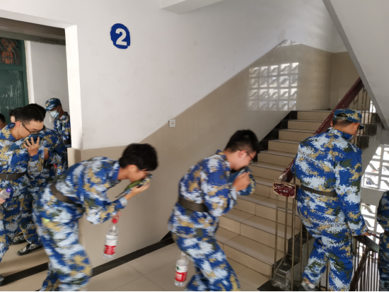 演练中,随着教官火灾警报的哨声响起,保卫处工作人员、新生辅导员第一时间赶赴现场,组织学生按照演练要求安全有序撤离;学生们积极响应,按照火灾防范要求,用沾湿的物品捂住口鼻,弯腰靠右快速撤离宿舍。