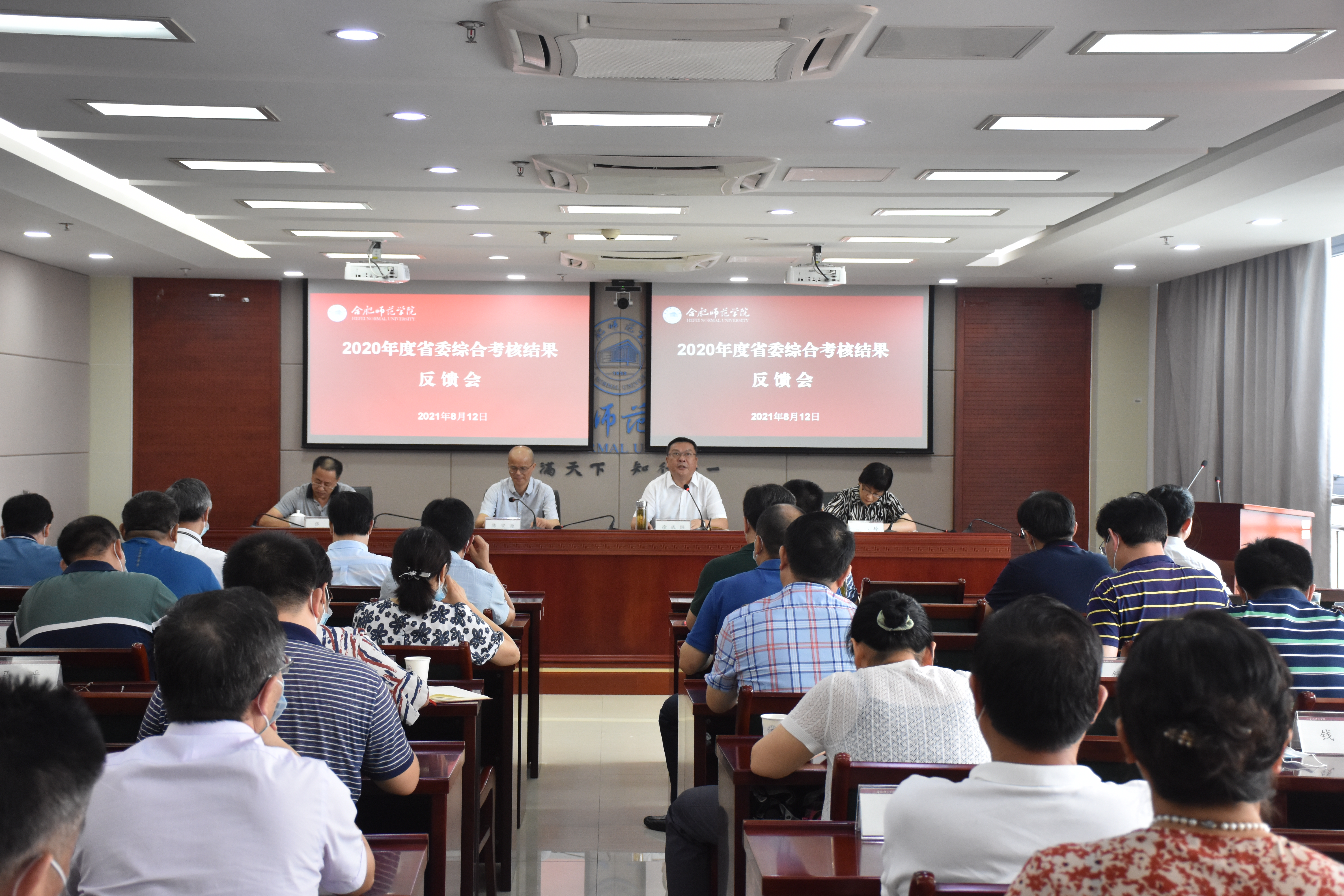 本网讯 8月12日,根据省委综合考核工作统一部署,学院在锦绣校区行知楼2011会议室召开2020年度学院领导班子和领导干部综合考核反馈会。省委第十四综合考核组联络员、省人才办副主任、一级调研员陈安源,省委组织部副处级巡视专员张军出席会议。院领导徐成钢、方东玲、吴昕春、谢阳群、姚本先、曹卓良、徐文林参加会议。会议由院党委书记徐成钢主持。