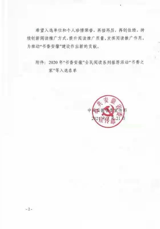 本网讯 近日,中共安徽省委宣传部印发《关于2020年“书香安徽”全民阅读系列推荐活动“书香之家”等入选名单的通报》,我校机关第二党委书记钱立青入选全省“十佳阅读推广人”。
