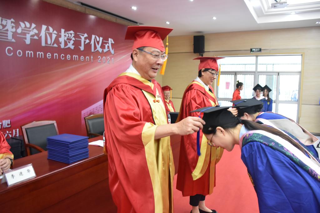 伴随着轻快的乐曲,徐成钢、方东玲为荣获硕士学位、身着硕士服的2021届硕士毕业生授学位,徐成钢、方东玲、李进华、吴昕春、姚本先、曹卓良、徐文林为荣获学士学位、身着学士服的毕业学子们授学位,为他们扶正流苏、颁发学士学位证书并合影留念。激动与喜悦写在每一位毕业生的脸上,温馨与感动留在每一位毕业生心中。