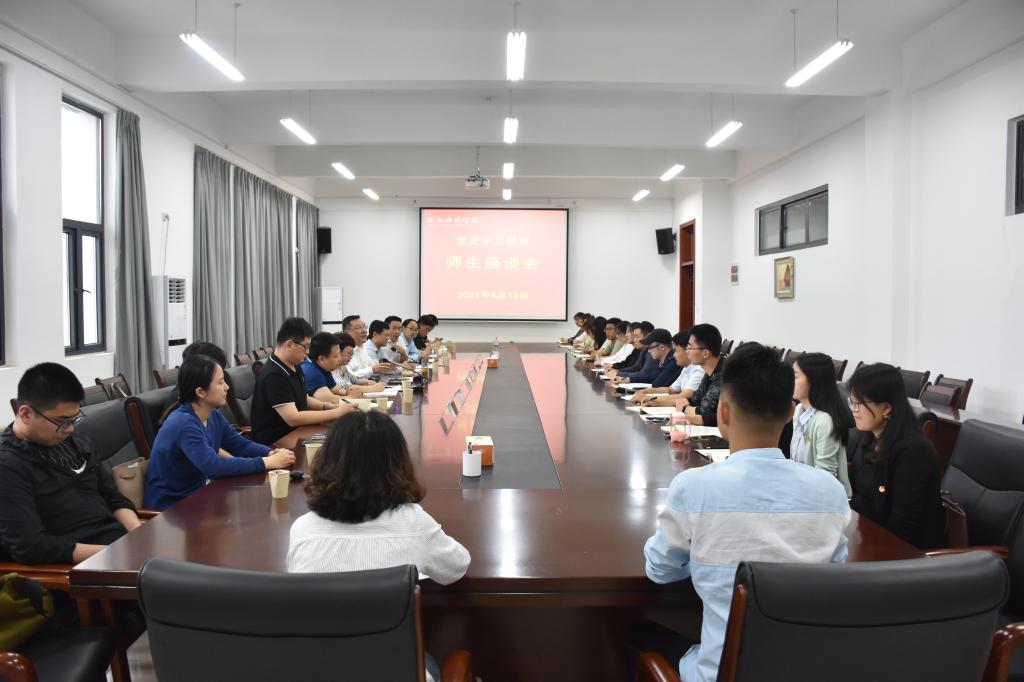 本网讯 为深入学习宣传贯彻习近平总书记在党史学习教育动员大会上重要讲话精神,贯彻落实学院党史学习教育实施方案,5月13日,学院在滨湖校区召开党史学习教育师生座谈会。院党委书记徐成钢与师生代表座谈交流并讲话,学生工作部、宣传部、团委、后勤处、保卫处、滨湖办等部门负责人,各二级学院辅导员代表及学生代表参加座谈。会议由学生工作部部长陆涛主持。