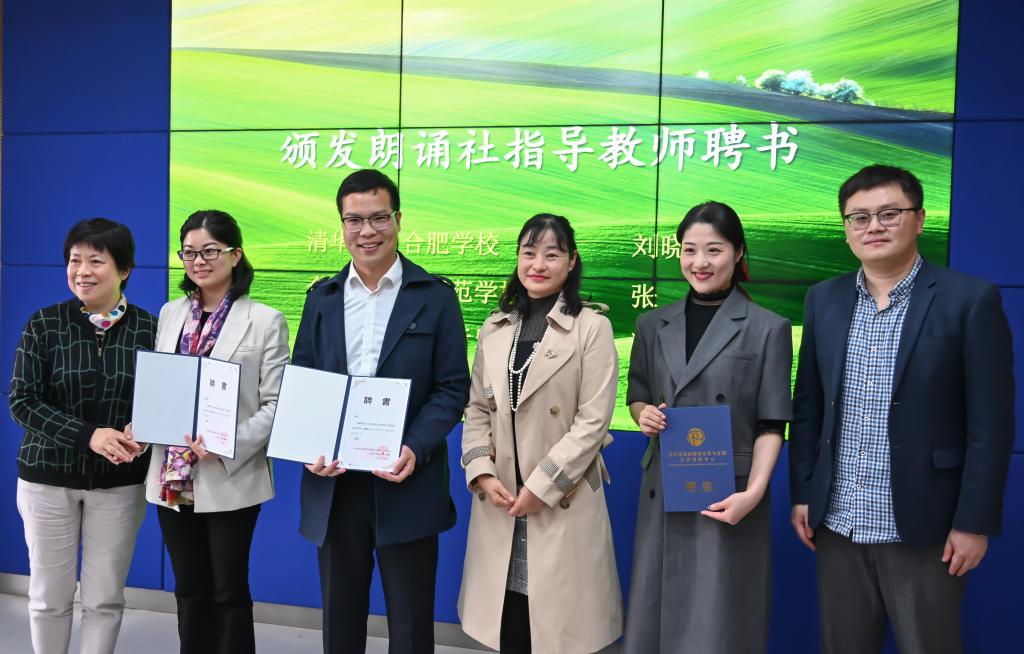 教师教育学院党委书记穆娟、院长李群、校团委副书记刁文彬为朗诵社指导教师清华附中合肥学校教师刘晓芳、合肥市黄麓师范学校教师张春、beat365唯一官方网站音乐学院教师江楠颁发聘书。