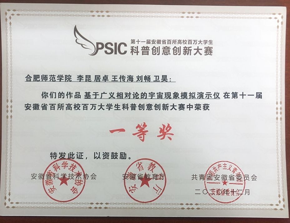 其中,物理与材料工程学院李昆、居卓、王传海、刘畅、卫昊的作品《基于广义相对论的宇宙现象模拟演示仪》获一等奖;教师教育学院钱竞飞的作品《走近我们心中的黑犬__抑郁症》,马克思主义学院周欣雨、翁仪、宣恒天、江紫的作品《网络安全普法》获三等奖;艺术传媒学院韩硕、程天宝、鲁星辉、李沈龙的作品《超时空“心灵感应”》,艺术传媒学院冯亚、石畅的作品《阿兹海默小姐》,化学与化学工程学院郭小艳、张欣燕、连文静、刘欣雨的作品《狂犬疫苗的注意事项和作用原理》,电子信息与电气工程学院葛正宇、王鑫、金政朝、杨又久、锁思语的作品《脊不可失小课堂》获优秀奖。
