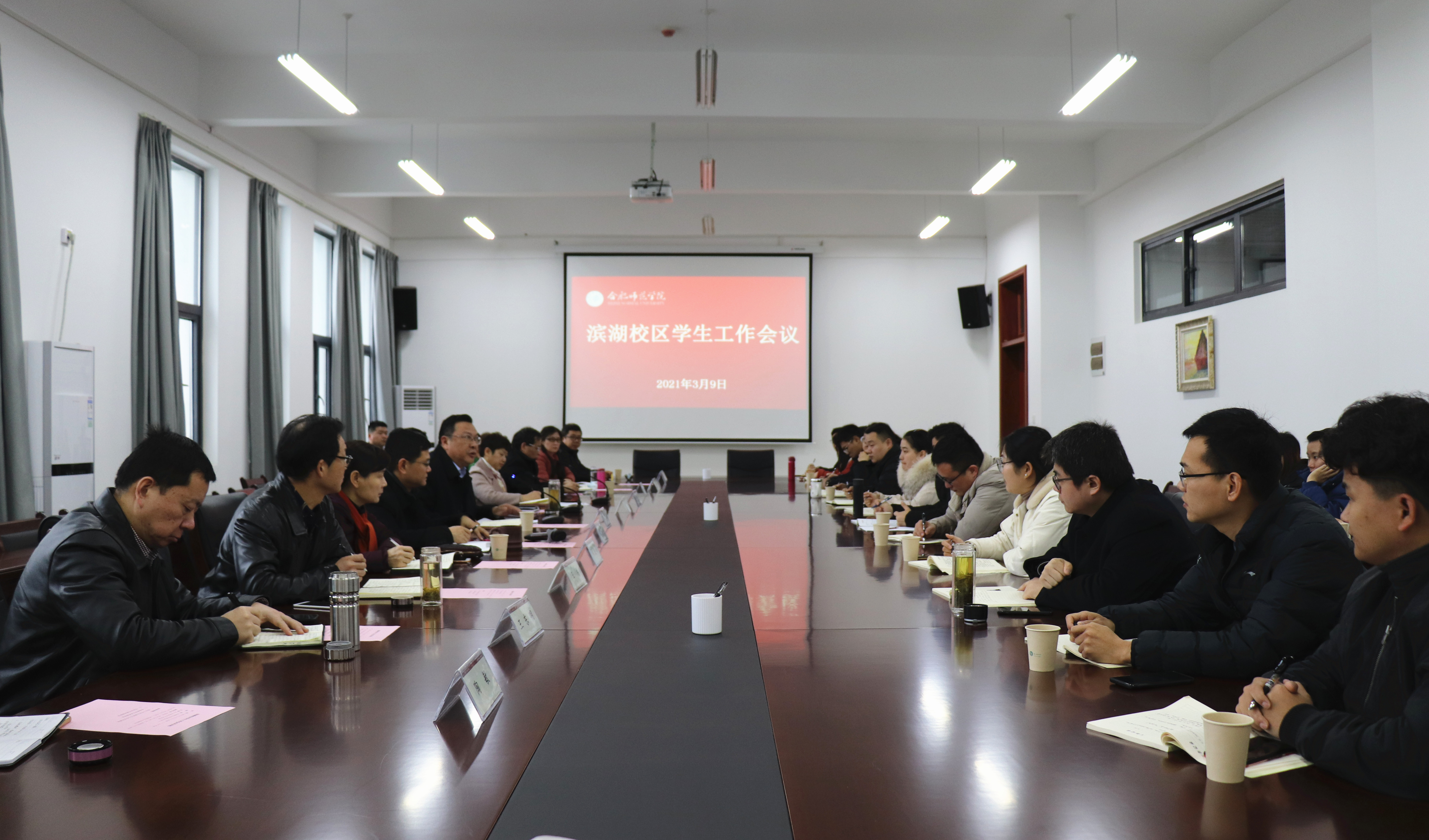 本网讯 3月9日上午,学校在滨湖校区铭传楼召开滨湖校区学生工作会议,党委书记徐成钢,党委副书记吴昕春出席会议并讲话。滨湖校区综合管理办公室、学生工作处、滨湖校区各二级学院分党委(党总支)负责人,滨湖校区全体辅导员参加会议。